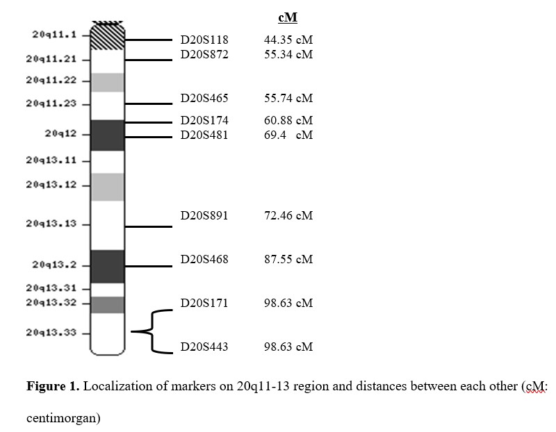 PCR amplification was performed in a total reaction volume of 25 µl. 60 ng of genomic DNA were subjected to PCR, performed in a final volume of 25 µl containing 0.2 mM of each dNTP, 1 µM each primer, 25 mM MgCl2, 0.5 U Taq polymerase, and 1X PCR buffer (New England Biolabs, UK). 1 µl formamide was added per tubes as an enhancer for reaction. Thirty- five cycles of denaturation at 94 0C for 45 seconds, annealing between 55-70 0C for 45 seconds, and extension at 72 0C for 45 seconds were performed with a thermal cycler (Takara, Japan). The annealing temperature was changed depending on base pairs of primers between 55-70 0C. After PCR amplification, all PCR products were analyzed with 1.5% agarose gel electrophoresis. An updated idiogram of the 20q11-13 region was obtained from http://www.ncbi.nlm.nih.gov/genome to illustrate the localization of markers and the distance between markers (Figure 1).